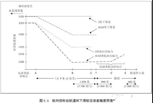 如上图所示,ABCTDE不同的着陆点,其中D和E只适用于III类航向信标台,也就是说到达D和E时,符合III类的航道容差。